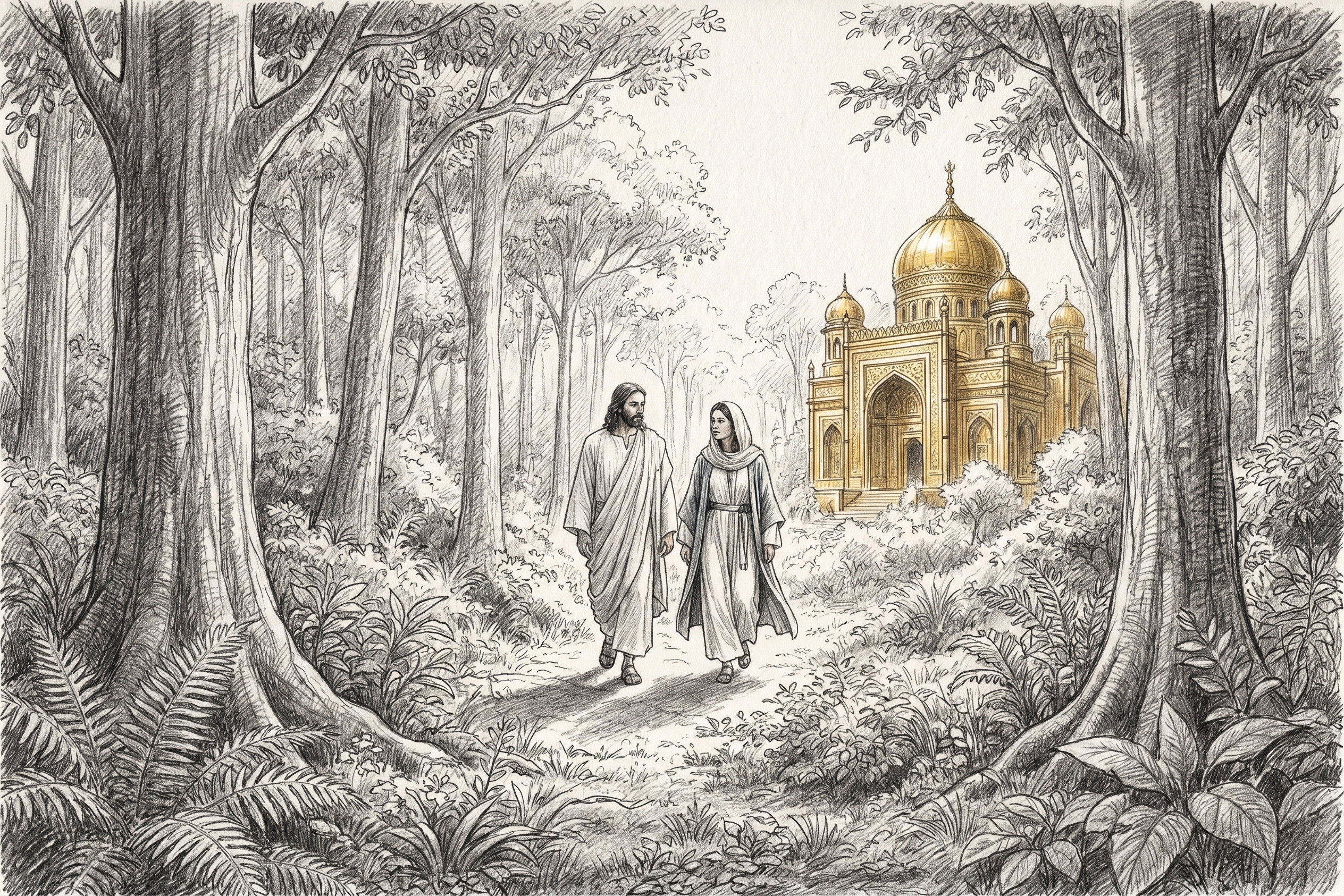 38. Lot's wife looks back and becomes salt, Genesis 19:26. Love draws a hard boundary. Staying in a toxic, condemned city would kill her anyway, and the sign warns others to keep moving toward safety.